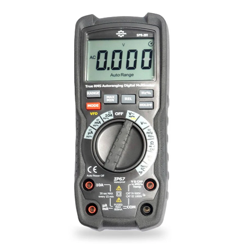 Spartna SPR- 201 Industrial digital multimeter measure AC / DC voltage, AC / DC current, resistance, frequency (electrical and electronic), diode test and continuity, it features a waterproof, rugged design for heavy duty use.